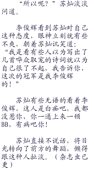 直播的镜头扫过众多选手,也不知道摄像大哥是不是也是苏灿的粉丝,镜头扫到苏灿的时候足足给了十几秒的定格时间,电视机前所有的观众都看到了闭眼陷入沉思状态的苏灿。