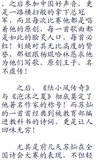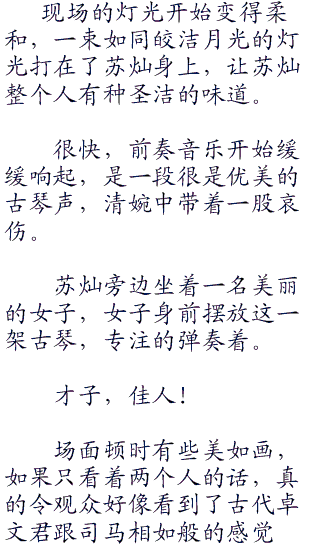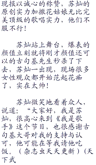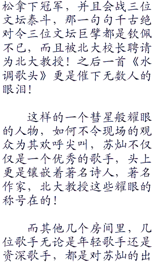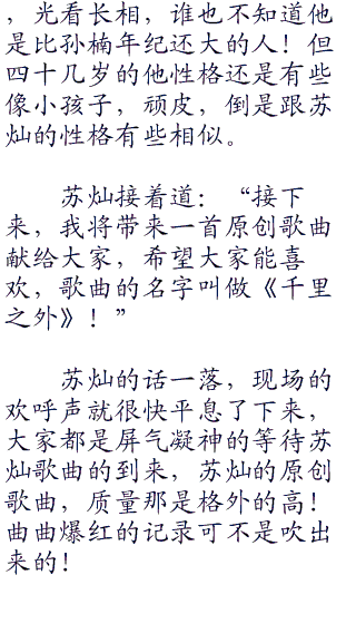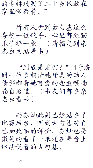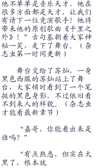 古句基接着看了一下自己手中的讲稿,有些吃惊的好像看到了什么,抬头对着观众们说道:“下一个歌手,是我非常喜欢的歌手!他的歌我每首都听!他
