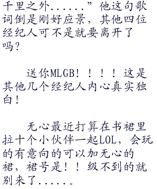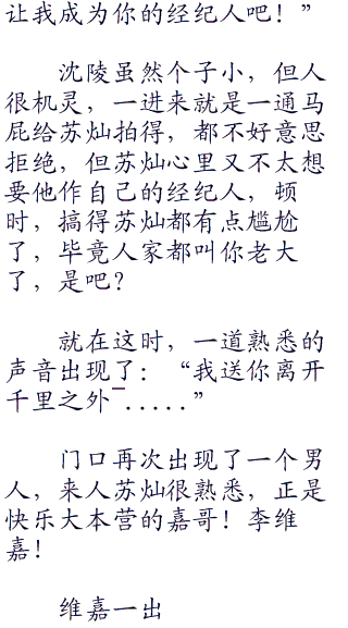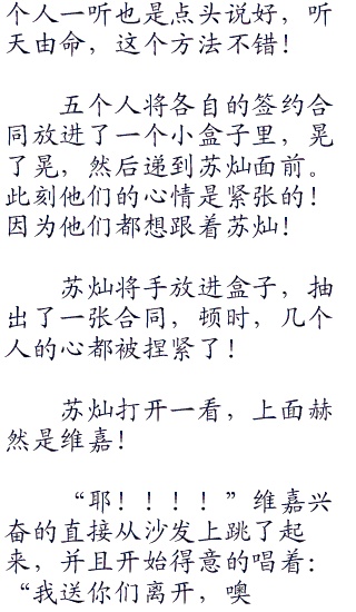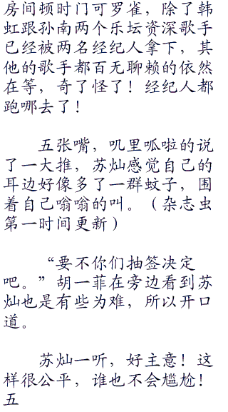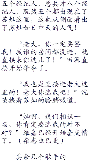 “苏灿,你想跟谁签约?要是到时候来的经纪人让你不满意怎么办?”胡一菲问道,经纪人对歌手的帮助是很大的,需要经纪人安排很多事情,包括抽签,这些对歌手的排名至关重要。
