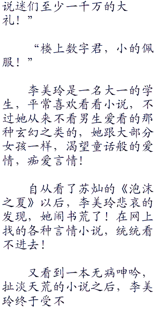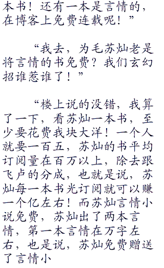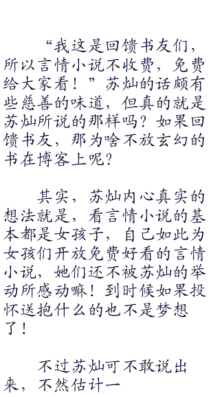“苏灿,你为什么一直将言情小说放在博客里让大家免费看呢?”青花疑惑的问道。