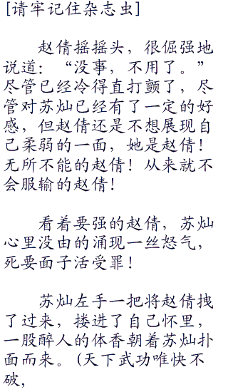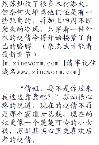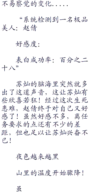 在进神农架的时候,赵倩其实知道苏灿很害怕,但他还是装作丝毫不惧的样子,赵倩知道,他是在给自己打气,给自己安全感,苏灿做的很成功,有了他,她确实不再害怕了!