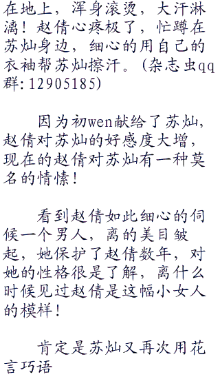 赵倩睁开了美目,一眼就看到近在咫尺的苏灿,不过此刻的他并不再像昨天那样霸道的欺负自己,苏灿的脸色很红,他的额头已经满是汗珠。