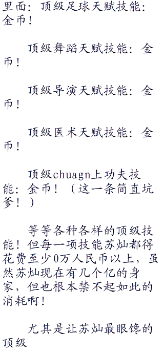 各种眼花缭乱的顶级技能看的苏灿心头痒痒不已。顶级舞蹈天赋技能、顶级导演天赋技能、顶级足球天赋技能、顶级体质技能....这些技能让苏灿口水都要流出来