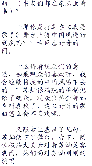 苏灿缓缓的从后台黑暗的地方走到了舞台中央,一束洁白的灯光打在苏灿的身上,顿时令所有人都眼前一亮!