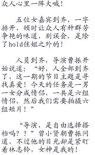 前四位女嘉宾的出现,都让宝强祖篮他们几个男的都是心里一阵小激动,没想到今天来的都是女神!还有最后一个没有出场了!肯定也是一位女神吧!