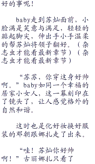 baby点头说:“对啊,我忽然觉得苏苏这个名字特别好听,以后我就叫你苏苏好不好?”说完还撒娇似的摇了摇苏灿的手臂。