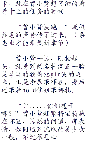 “征途这游戏不错,我玩儿过。”曾小贤忽然来了一句,果然是**丝,连这个都能想到游戏,可惜并没有人理会他。