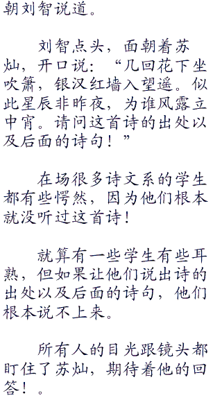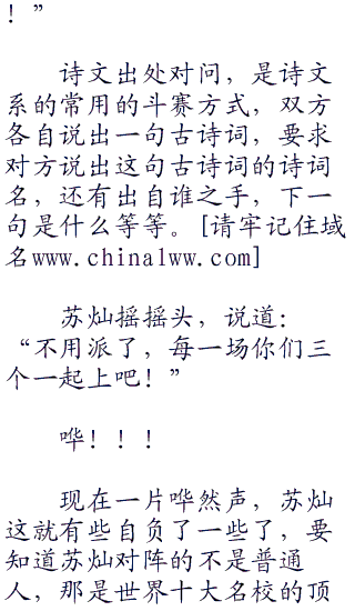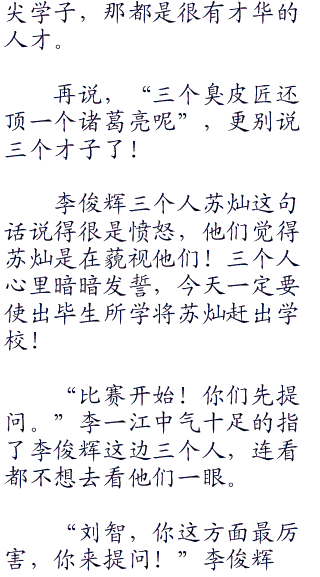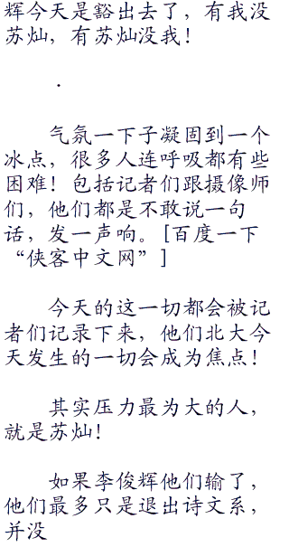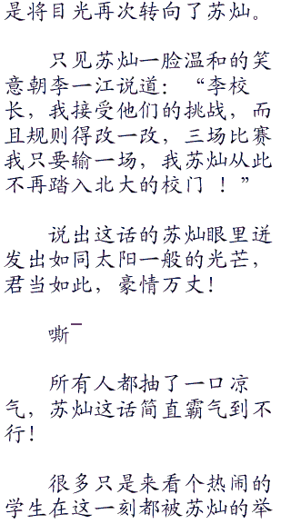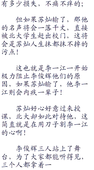 李俊辉开口了,说:“如果你赢了,我们三个人当场向你道歉,并且退出诗文系!如果你输了,那就请你自觉离开北大,我们诗文系不需要你来教!”