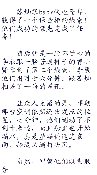 曹振忍着笑意,开口说道:“开始之前,我和你们说一下任务规则,你们需要在七分钟之内通过海湾,那里有三个保险柜,每个保险柜里都有一个能够解开护照线索的道具,每一组到达都能解开一个柜子。