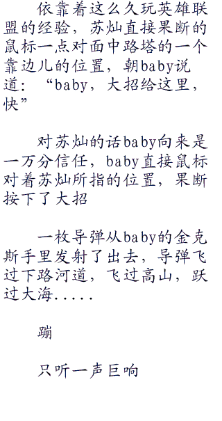 baby的声音对苏灿来说就是天籁baby玩的是金克斯,金克斯6级之后的大招是发射一枚飞毛腿导弹,还是全图的那种。