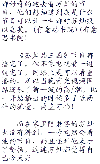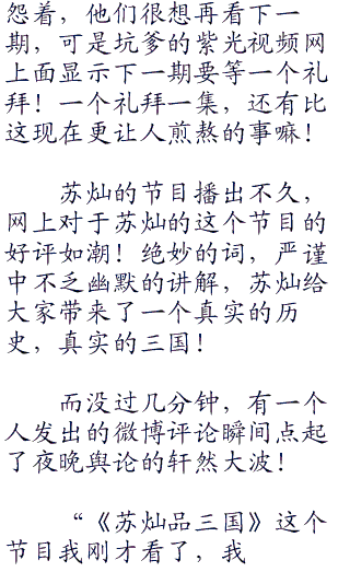 “本期大江东去就到这里结束了,下一期魏武挥鞭我再跟大家好好地品一品这纷乱的三国,这里是《苏灿品三国》,我们下期节目,再见!”