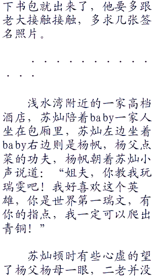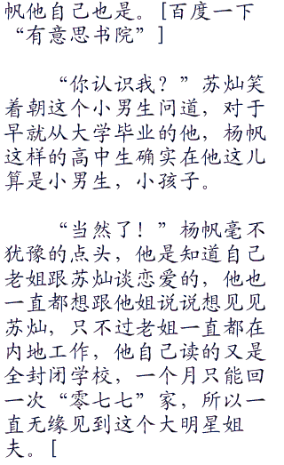 对于苏灿,杨帆可是很崇拜的,苏灿也是他很崇拜的明星,他们这些年轻人有谁不喜欢苏灿呢,尤其是女同学,那几乎十个九个都是阳光,杨