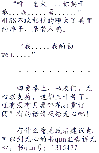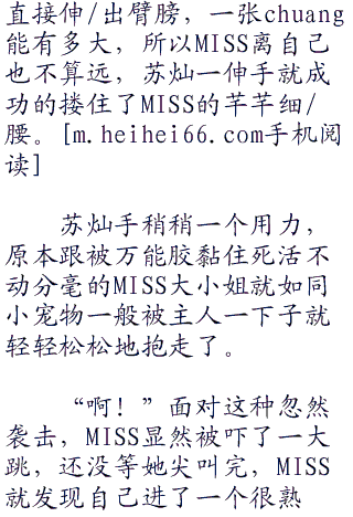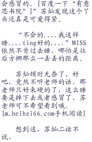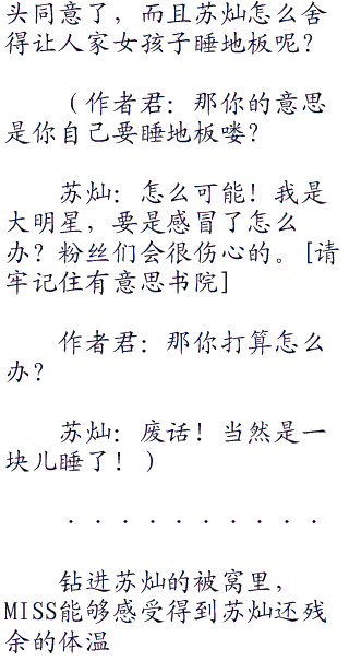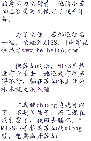 “老大,让我在你房间里睡一晚好不好,就一晚,我睡地板上,打地铺就可以了。”在苏灿怀里的MISS抬起小脑袋,美/目楚楚可怜的看着苏灿,柔声地恳求道,她实在怕打雷,不然也不可能让她这么传统的女孩子大半夜去找苏灿。
