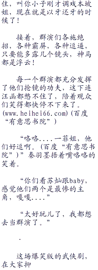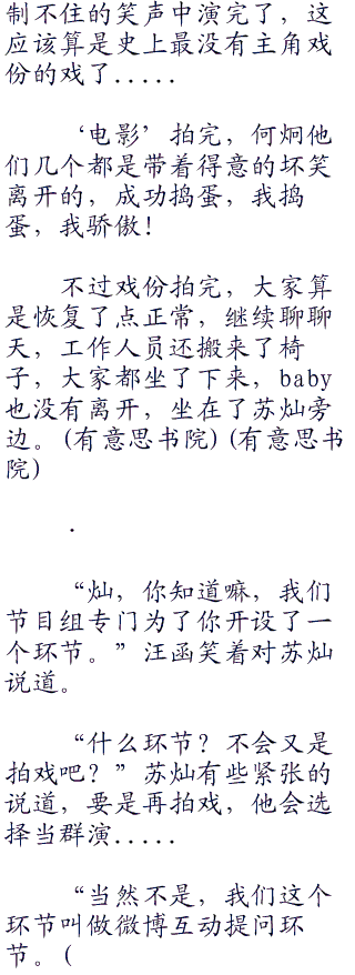 baby再一次忍不住笑了出声,笑着睁开了眼睛,朝汪函抗议着说道:“导演,我抗议,他们几个抢镜!”