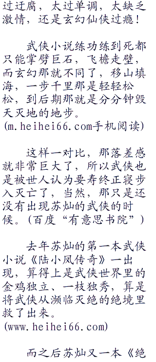 有调查统计,平均每十位小说迷当中,有六位是玄幻跟仙侠迷,还有两位是都市迷,还有两位名额能被武侠迷占据的概率小得可怜。