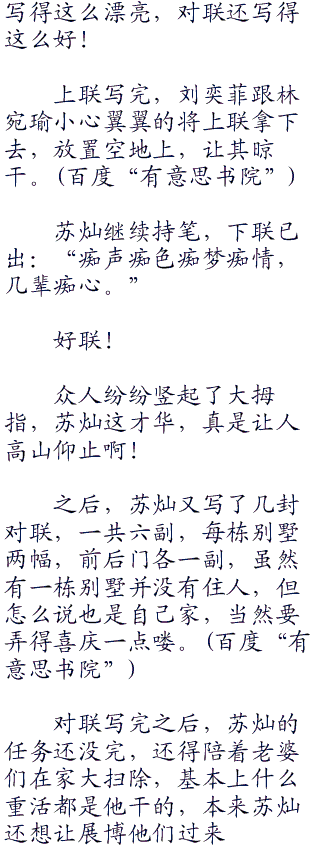 思虑了一会儿,苏灿心中已定,开始笔走龙蛇的在纸上飞舞了起来,大家睁大了眼睛盯着渐渐成行的上联。