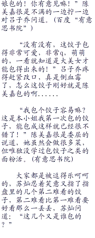 “对啊,这谁包的饺子,好难看啊!”吕子乔毫不犹豫的鄙视道,这包饺子的手艺,简直赶得上他下午剁肉的手艺了。