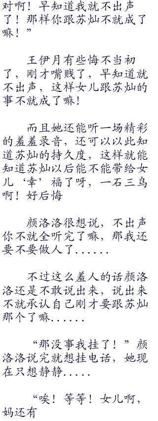 “颜洛洛,你再不说话我就当你被苏灿霸王硬上弓了,我就报警了哈!”王伊月的声音再次传来。