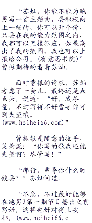 “苏灿,今年是跑男第二季,所以我们打算将跑男的主题曲换一下,做个改革。”曹振对苏灿说道。