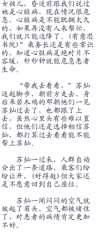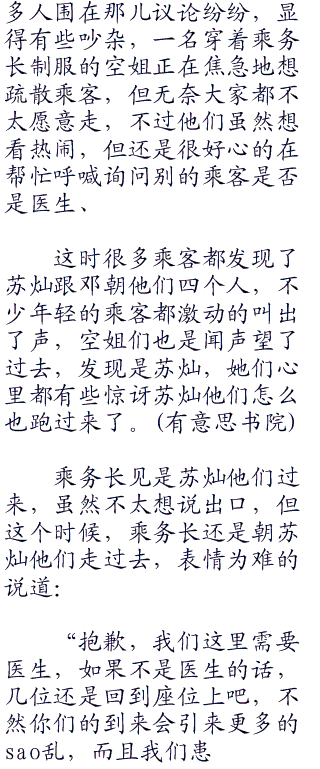 四个人表情都有些担忧,毕竟在飞机上犯病是很麻烦的事情,因为这里没有急救人员,要找医生,只能看乘客里有无医生,如果没有,飞机就只能被迫在最近的城市降落。