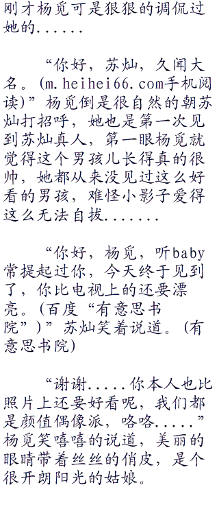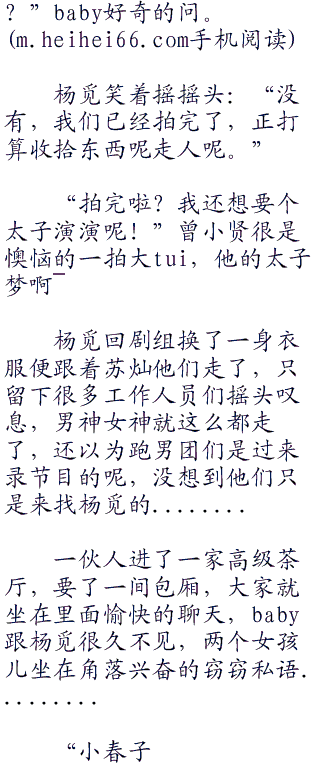 “好啦,不逗你了,不过小影子你倒却是越长越漂亮了呢。”杨觅说完又凑到baby耳旁悄声的问:“是不是每天被男朋友滋润了的缘故呀?”