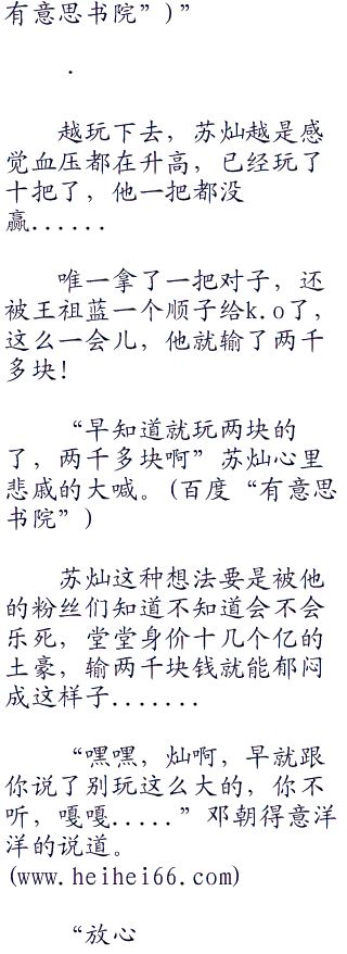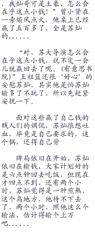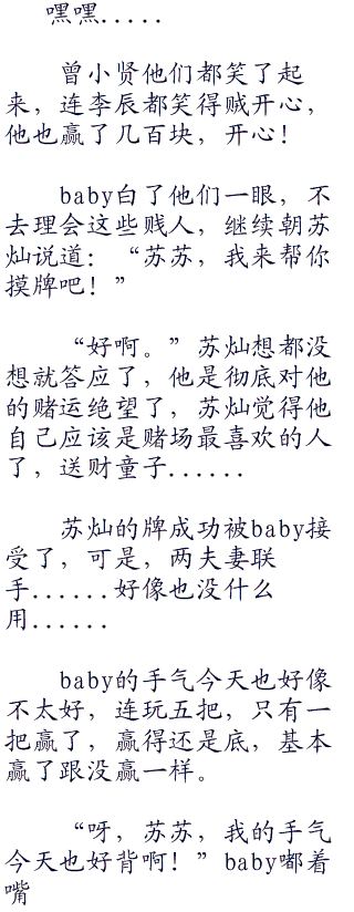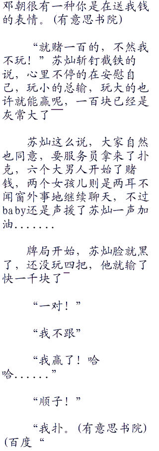 本来苏灿是不想玩的,因为他赌博一般都是十赌九输,牌运真的差上次英雄联盟明星赛那天晚上他就输了一百多块,注意,那可是一块钱的底注啊!