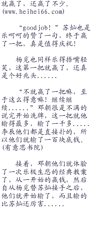 第一把,杨觅就给苏灿摸出了一条顺子!还是qka的最大顺子,邓朝当时也拿了把顺子,所以两人跟着上了不少钱,开牌之后,邓朝就傻眼了,一把输了刚才赢来的总数的一半!