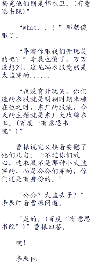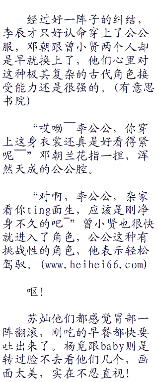 baby跟杨“七九三”觅也是笑得花枝招展,朝哥他们三个人选了公公服,这肯定是要当太监的......