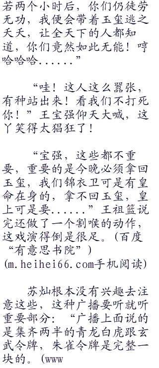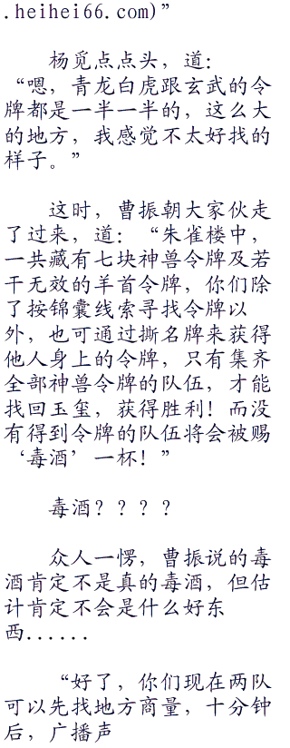 “大人们,玉玺就被我藏在这朱雀楼中,你们需集齐一分为二的青龙、玄武和白虎令牌和另一块完整的朱雀令牌,才能找到玉玺。