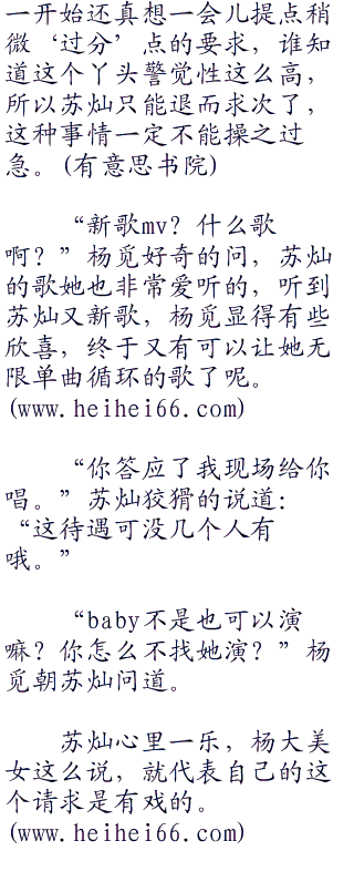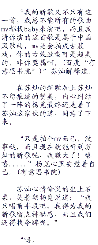 “放心,我的要求很简单,我有一首新歌的正好缺一个女主角,你就当帮我个忙呗。”苏灿