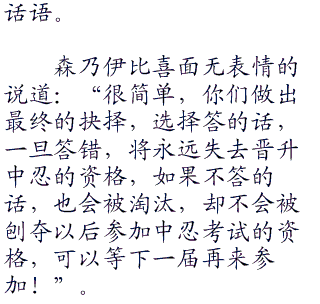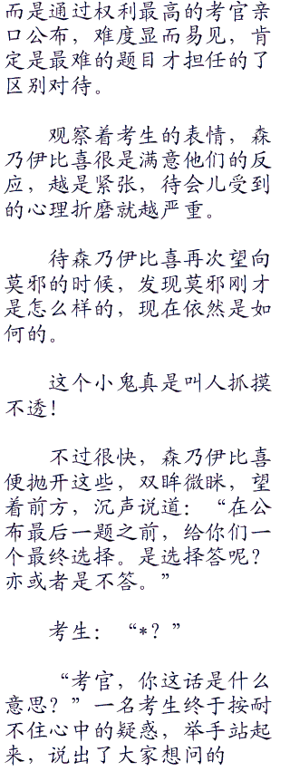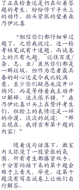 “相信你们都仔细审过题了,之前我说过,这一轮考核笔试有十道题,而试卷上的只有九题。虽然你们都是一群垃圾,但作为忍者最具备的耐心还是令我比较满意,至少你们疑惑也没开口询问,而是等待着我主动开口解释,这点很不错。”森乃伊比喜口头上在赞许考生们,但脸上的表情还是一样的冷漠,淡淡的说道:“那么现在,我将宣布第十题的内容!”