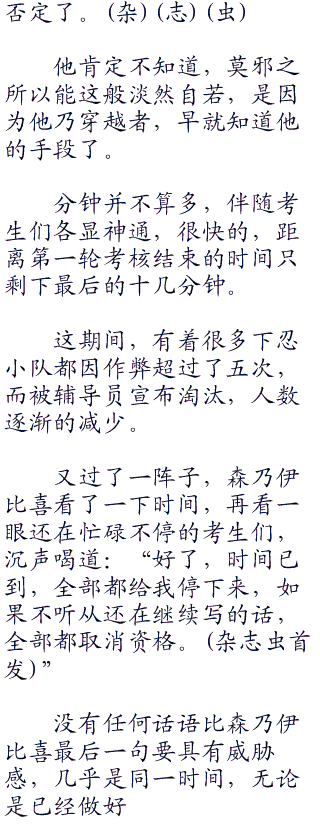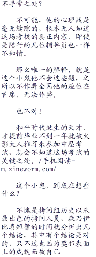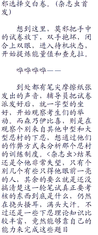 到处都有笔尖摩擦纸张发出的声音,辅导员把试卷派发好后,就一字型的坐好,开始观察考生们的举动。而森乃伊比喜,则是在观察个别来自其他中型和大型忍村的下忍,想通过他们的作弊方式来分析那个忍村的训练制度。结果还是令他非常失望,只有个别几个有些只得他眼前一亮的人,其余的要么就是还没搞清楚这一轮笔试真正要考核的东西到底是什么,仍然在挠头搔耳,满头大汗。不过还是一些下忍理论知识比较丰富,竟然能够靠自己的能力来完成这些题目。