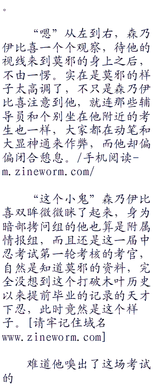 拿起放在桌面上的试卷,莫邪浏览了一遍,最终得出结论,上面的题目他一条都不会做,毕竟他只入学三个月就申请提前毕业,有很多理论知识都没有涉及过。而且,莫邪还是坐在首位,前面除了站在侧边讲台上的森乃伊比喜,再无其他人。就算他有写轮眼,也复制不了那些隐藏在学生群中的高知识分子的答案。