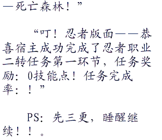 “叮!忍者版面——恭喜宿主成功完成了忍者职业二转任务第一环节,任务奖励:0技能点!任务完成率:!”