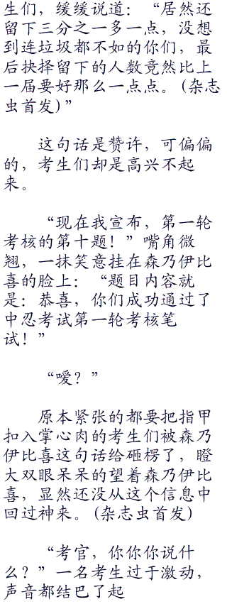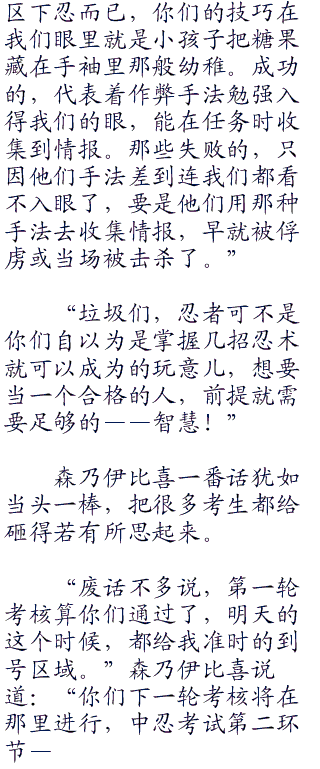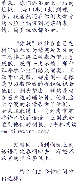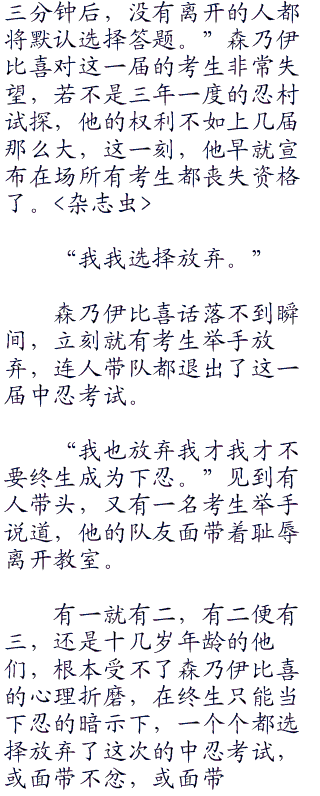 “你放”以往在自己忍村里被称之为精英和天才的下忍接二连三被森乃伊比喜贬低,贬得一文不值,那种耻辱感令他们怒火涌现,正欲开口反驳,却感到一道像是刀刃般锋锐的视线注视着他们,侧头望去,赫然是坐在窗户边的辅导员。他们脸上冷漠的表情告诉了他们,如果胆敢道出一句对考官有些许不敬的话语,立刻就会遭到他们的制裁。