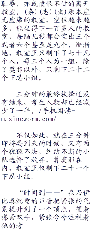 有一就有二,有二便有三,还是十几岁年龄的他们,根本受不了森乃伊比喜的心理折磨,在终生只能当下忍的暗示下,一个个都选择放弃了这次的中忍考试,或面带不忿,或面带耻辱,亦或愤恨不甘的离开教室。原本座无虚席的教室,空位越来越多,能坐得下一百多人的教室,每隔几秒都会空出三个或者六个甚至是九个,渐渐地,教室里只剩下了七十几个人,每三个人为一组,除了莫邪以外,只剩下二十二个下忍小组。