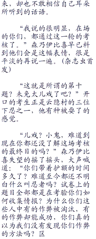 “儿戏?小鬼,难道到现在你都还没了解这场考核的最终目的吗?”森乃伊比喜失望的摇了摇头,大声喊道:“你们带着护额的时间多久了?难道至今都还不明白什么叫忍者吗?试卷上的题目全部都是在考验你们如何收集情报?为什么你们这些人中有的作弊被淘汰,有的作弊却能成功,你们真的以为我们没有发现你们作弊的方法吗?区区下忍而已,你们的技巧在我们眼里就是小孩子把糖果藏在手袖里那般幼稚。成功的,代表着作弊手法勉强入得我们的眼,能在任务时收集到情报。那些失败的,只因他们手法差到连我们都看不入眼了,要是他们用那种手法去收集情报,早就被俘虏或当场被击杀了。”