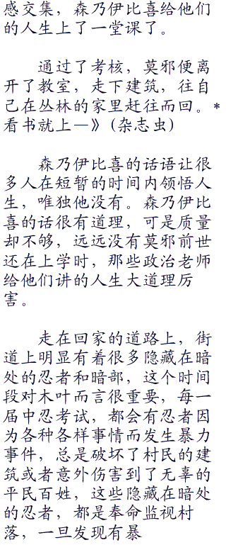 走在回家的道路上,街道上明显有着很多隐藏在暗处的忍者和暗部,这个时间段对木叶而言很重要,每一届中忍考试,都会有忍者因为各种各样事情而发生暴力事件,总是破坏了村民的建筑或者意外伤害到了无辜的平民百姓,这些隐藏在暗处的忍者,都是奉命监视村落,一旦发现有暴力事件,他们会立刻进行阻止。