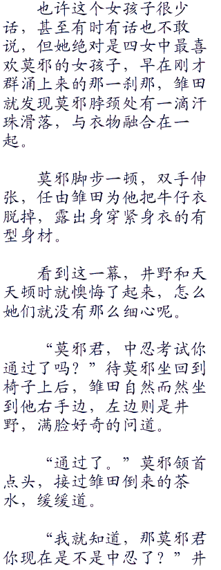 也许这个女孩子很少话,甚至有时有话也不敢说,但她绝对是四女中最喜欢莫邪的女孩子,早在刚才群涌上来的那一刹那,雏田就发现莫邪脖颈处有一滴汗珠滑落,与衣物融合在一起。