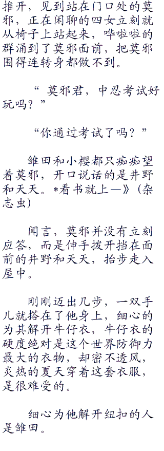 不等莫邪开门,一阵女孩子的嬉笑声就透过门的障碍传入他的耳中,这阵笑声颇为爽朗与活泼,敢这样说话的人且还是女孩子,在莫邪的认知中,四女里也就井野和天天。