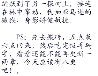 PS:先去搬砖,五点或六点回来,然后吃完饭再码字,看看还能不能再更新一两章,今天应该有八更吧!。