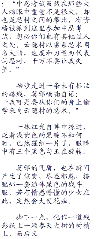 抬步走进一条未有标注的路线,莫邪喃喃自语:“我可是要从你们的身上偷学来自云隐村的忍术。”