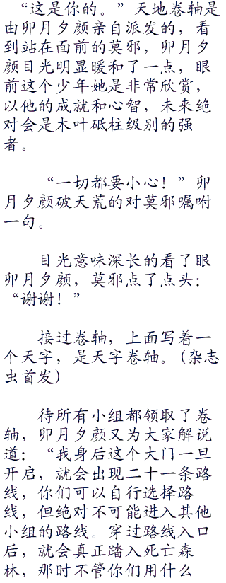 待所有小组都领取了卷轴,卯月夕颜又为大家解说道:“我身后这个大门一旦开启,就会出现二十一条路线,你们可以自行选择路线,但绝对不可能进入其他小组的路线。穿过路线入口后,就会真正踏入死亡森林,那时不管你们用什么方法和手段来狩猎其他小组获取卷轴都没关系。”