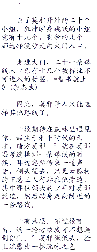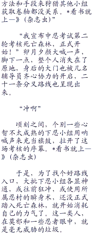 于是,为了找个好路线入口,大批下忍小组各显神通,或往前狂冲,或使用所属忍村的瞬身术,还没正式踏入死亡森林,就开始消耗自己的力气了。这一类人,在莫邪和一些忍者眼中,就是毫无威胁的垃圾。