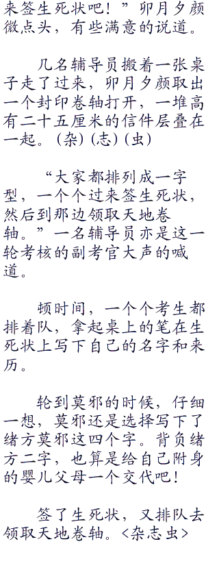 顿时间,一个个考生都排着队,拿起桌上的笔在生死状上写下自己的名字和来历。