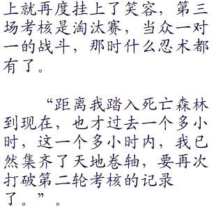 “距离我踏入死亡森林到现在,也才过去一个多小时,这一个多小时内,我已然集齐了天地卷轴,要再次打破第二轮考核的记录了。”。