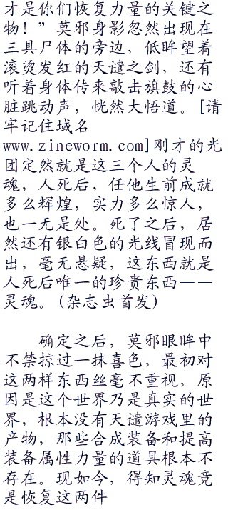 “基本上已经确定无误了,灵魂才是你们恢复力量的关键之物!”莫邪身影忽然出现在三具尸体的旁边,低眸望着滚烫发红的天谴之剑,还有听着身体传来敲击旗鼓的心脏跳动声,恍然大悟道。刚才的光团定然就是这三个人的灵魂,人死后,任他生前成就多么辉煌,实力多么惊人,也一无是处。死了之后,居然还有银白色的光线冒现而出,毫无悬疑,这东西就是人死后唯一的珍贵东西——灵魂。