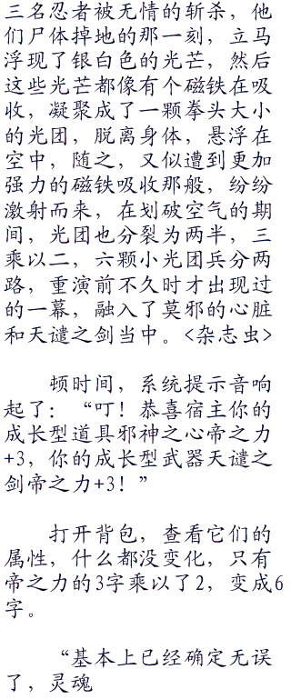 三名忍者被无情的斩杀,他们尸体掉地的那一刻,立马浮现了银白色的光芒,然后这些光芒都像有个磁铁在吸收,凝聚成了一颗拳头大小的光团,脱离身体,悬浮在空中,随之,又似遭到更加强力的磁铁吸收那般,纷纷激射而来,在划破空气的期间,光团也分裂为两半,三乘以二,六颗小光团兵分两路,重演前不久时才出现过的一幕,融入了莫邪的心脏和天谴之剑当中。
