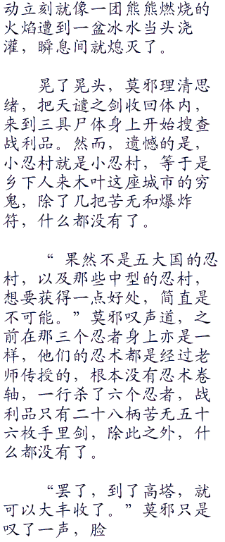 晃了晃头,莫邪理清思绪,把天谴之剑收回体内,来到三具尸体身上开始搜查战利品。然而,遗憾的是,小忍村就是小忍村,等于是乡下人来木叶这座城市的穷鬼,除了几把苦无和爆炸符,什么都没有了。