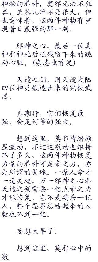 想到这里,莫邪情绪颇显激动,不过这激动也维持不了多久,这两件神物恢复力量的养料可是帝之力,亦是所谓的灵魂。一条人命才一道灵魂,万一邪神之心和天谴之剑需要一亿点帝之力才能恢复,岂不是要杀一亿人,整个忍界总结起来的人数也不到一亿。